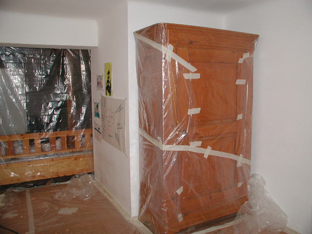 | Der übrige Teil des Hauses wurde (fast) hermetisch abgeklebt und mit Planen gesichert. | |||